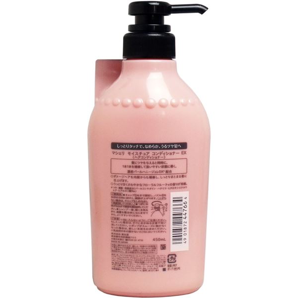 マシェリ モイスチュア コンディショナーEX ポンプ 450mL商品区分:化粧品髪にツヤを与えると同時に1本1本を補修して扱いやすい状態に導く、濃密パールハニージュレDX(パールコンキオリン・ハチミツ・ヒドロキシエチルウレア・ヒアルロン酸Na)配合のコンディショナーです。