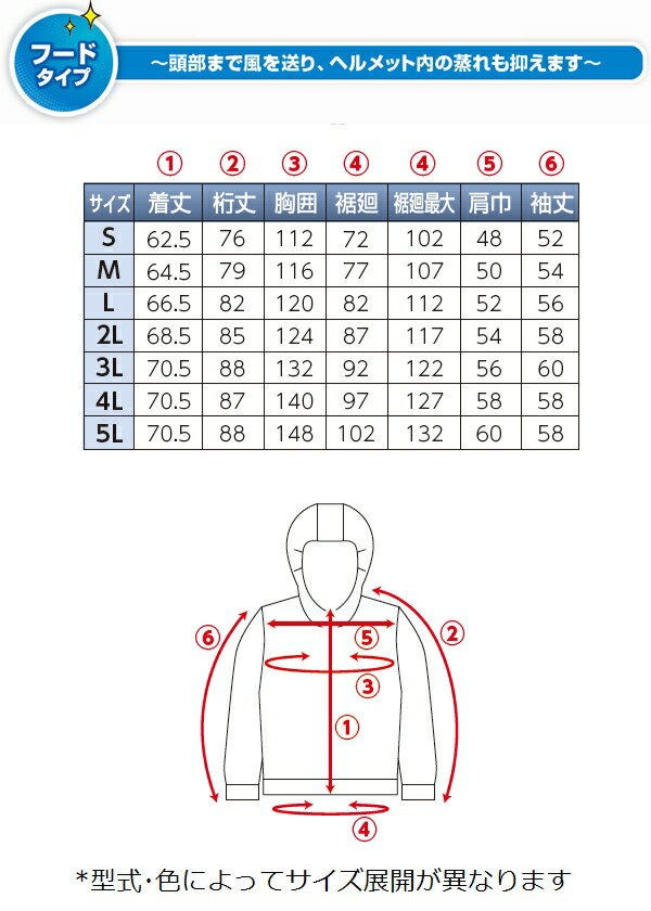 【基本形状】 サイズ:3L タイプ:フード 【機能一覧】 機能詳細は説明画像をご覧ください ・チタン仕様:〇 ・エアコンテック:〇 ・タチエリ用スペーサー:× ・肩・袖補強あり:〇 ・保冷パック用ポケット:〇 ・ネームループ:〇 ・バッテリーポケット:〇 ・腕部ペン刺し:〇 ・胸部ポケット:〇 ・ケーブル穴:○ ・フード内側すべり止め:〇 ・背中風道:〇 ・襟元調整ひも:〇 【おすすめポイント】 頭部まで風を送り、ヘルメット内の蒸れも抑えます。