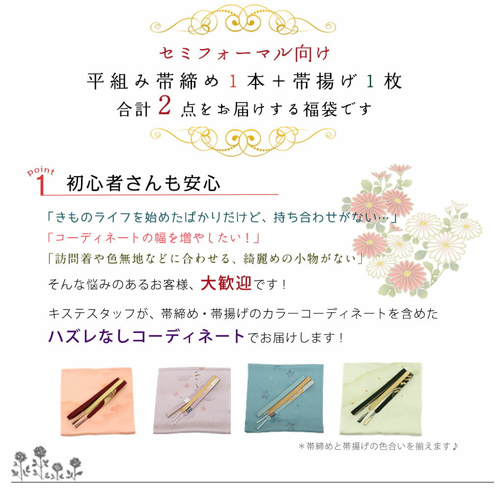 配送方法 宅配便 / メール便商品情報 平組の帯〆1本+帯揚げ1枚、計2枚の福袋です! 訪問着や色無地をはじめとしたセミフォーマルシーンの着物で幅広く使えるカラー展開です。