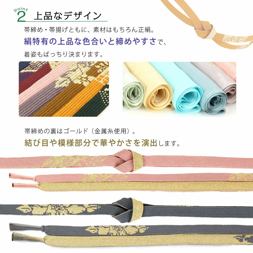 商品情報 平組の帯〆1本+帯揚げ1枚、計2枚の福袋です! 訪問着や色無地をはじめとしたセミフォーマルシーンの着物で幅広く使えるカラー展開です。