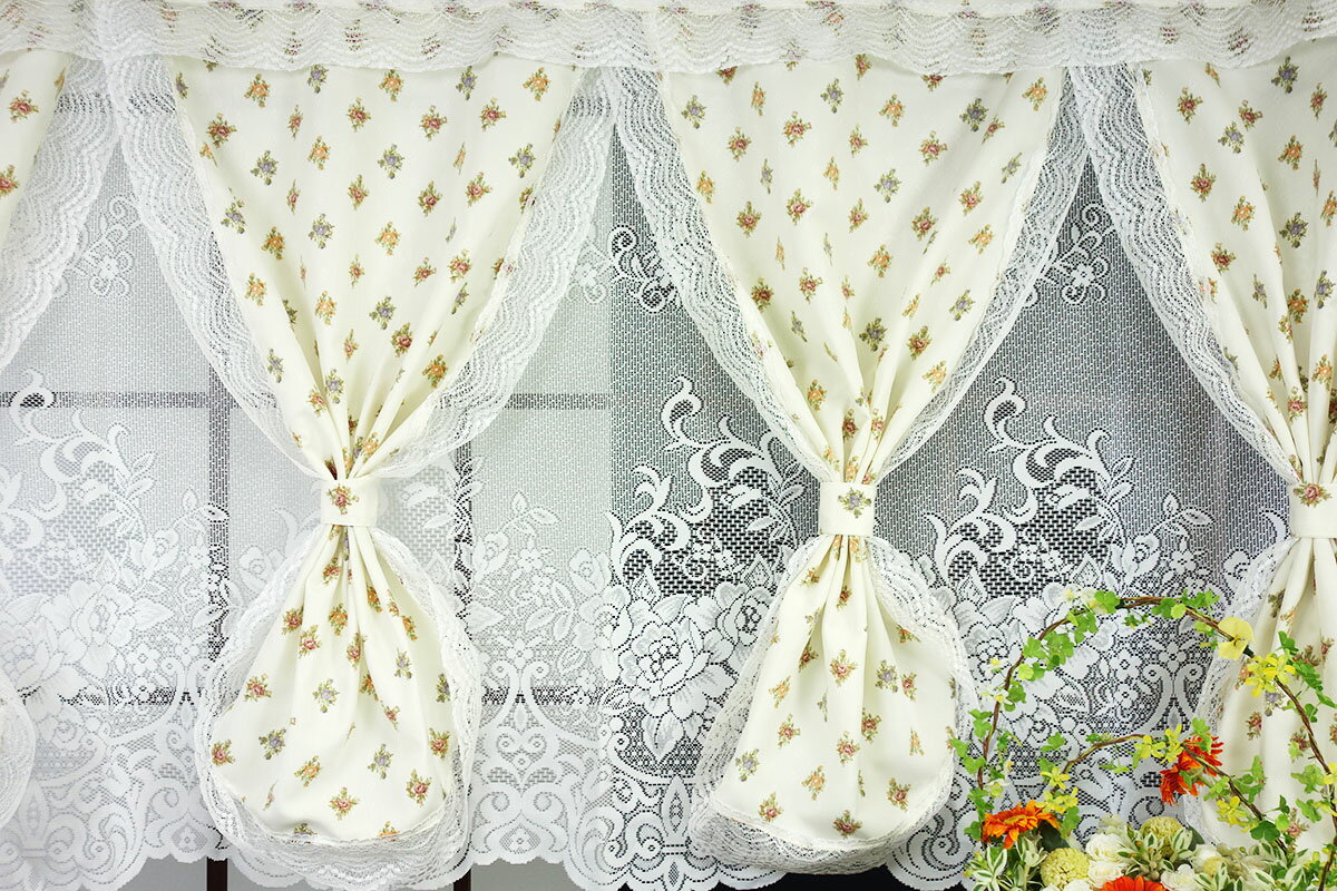 出窓用カーテン フリーダム 幅200cm 丈105cm おしゃれな4連セパレーツカーテン 裾スカラーカット クリーム色 ベージュ色 フリル タッセル フック付 普通窓にも使用可 メーカー直売の当店オリジナル商品 即発送可能 日本製