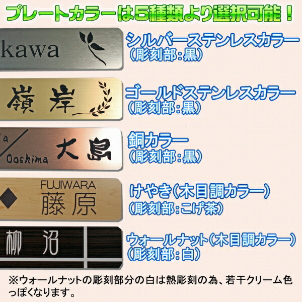 (ステンレスシルバー・ステンレスゴールド・銅・木目ウォールナット・けやき)デザインは校正まで含めて2つまで無料。
